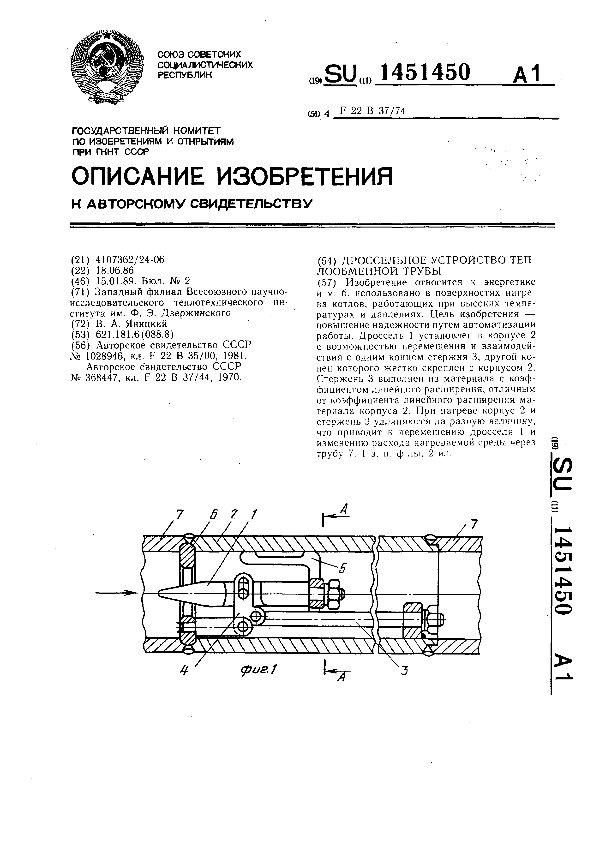 Дроссельное устройство теплообменной трубы / Яницкий В. А.; заявитель: Западный филиал Всесоюзного научно- исследовательского теплотехнического института им. Ф. Э. Дзержинского // Описания изобретений (ретрофонд) / Комитет по патентам и товарным знакам России. – М., 2003. – 1989, № 1. — (Патенты России). — Загл. с титул. экрана. — Поисковая система: ИПС MIMOSA GTI. — Систем. требования: Acrobat Reader. — Режим доступа: ftp://smolensklib.ru/bd/patent_ru/pt1451450.pdf. — <URL:ftp://smolensklib.ru/bd/patent_ru/pt1451450.pdf>.