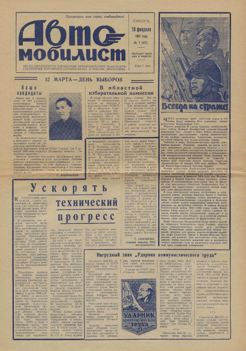 Автомобилист: Орган Смоленского управления автомобильного транспорта, управления дорожного строительства и Обкома профсоюза. — Смоленск: Смолгортип., 1966-____. № 22.