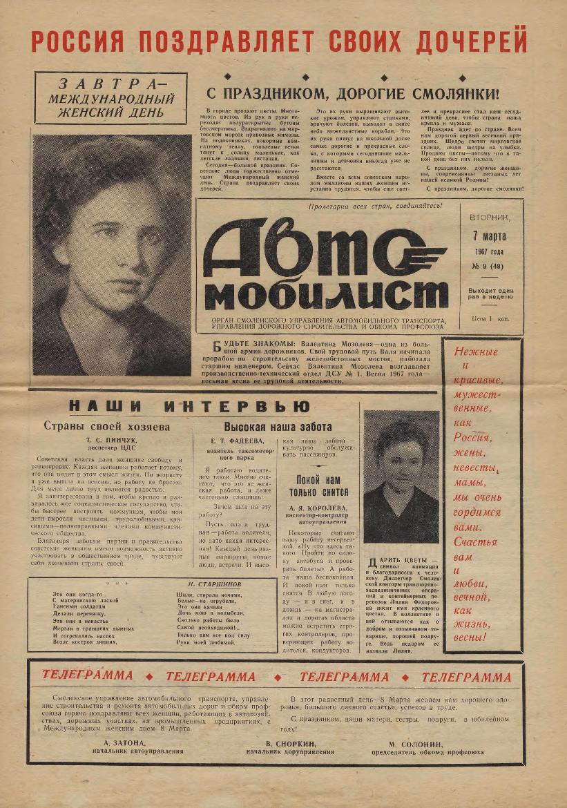 Автомобилист: Орган Смоленского управления автомобильного транспорта, управления дорожного строительства и Обкома профсоюза. — Смоленск: Смолгортип., 1966-____. № 26.