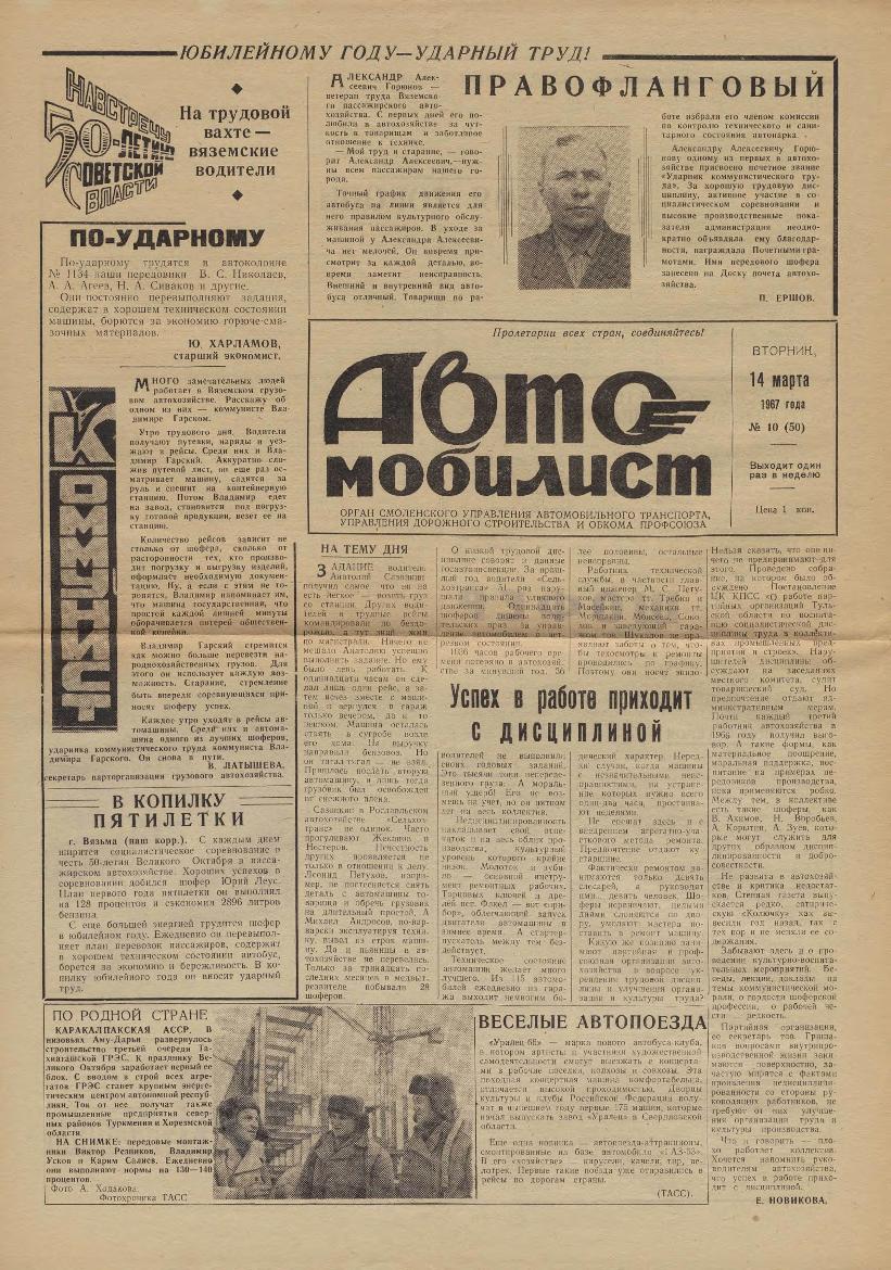 Автомобилист: Орган Смоленского управления автомобильного транспорта, управления дорожного строительства и Обкома профсоюза. — Смоленск: Смолгортип., 1966-____. № 10.