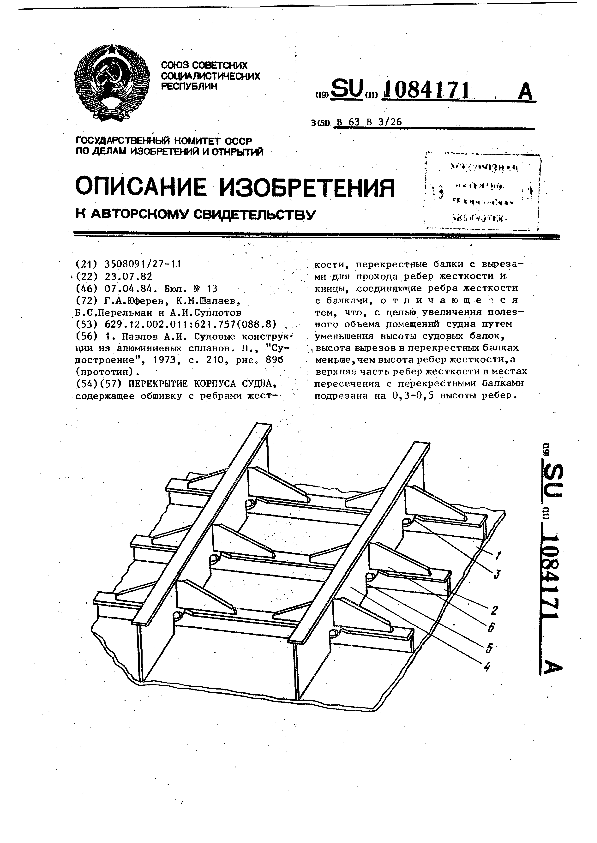 Перекрытие корпуса судна / Юферев Г. А., Шалаев К. М., Перельман Б. С., Суплотов А. И. // Описания изобретений (ретрофонд) / Комитет по патентам и товарным знакам России. – М. — (Патенты России)., 2003. – 1984, № 1. — Загл. с титул. экрана. — Поисковая система: ИПС MIMOSA GTI. — Систем. требования: Acrobat Reader. — Режим доступа: ftp://smolensklib.ru/bd/patent_ru/pt1084171.pdf. — <URL:ftp://smolensklib.ru/bd/patent_ru/pt1084171.pdf>.
