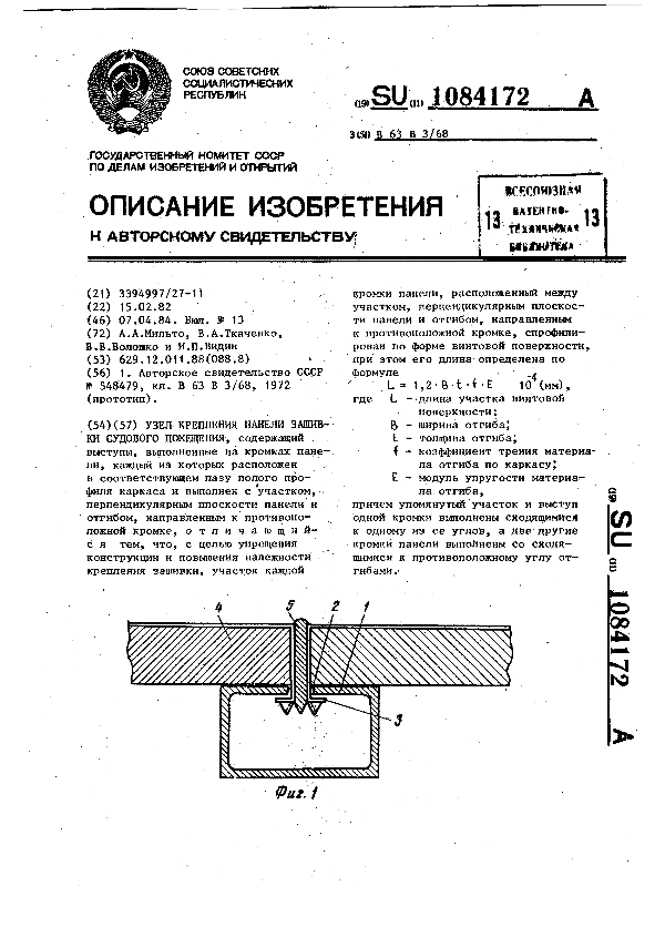 Узел крепления панели зашивки судового помещения / Мильто А. А., Ткаченко В. А., Волошко В. В., Видин И. П. // Описания изобретений (ретрофонд) / Комитет по патентам и товарным знакам России. – М. — (Патенты России)., 2003. – 1984, № 1. — Загл. с титул. экрана. — Поисковая система: ИПС MIMOSA GTI. — Систем. требования: Acrobat Reader. — Режим доступа: ftp://smolensklib.ru/bd/patent_ru/pt1084172.pdf. — <URL:ftp://smolensklib.ru/bd/patent_ru/pt1084172.pdf>.