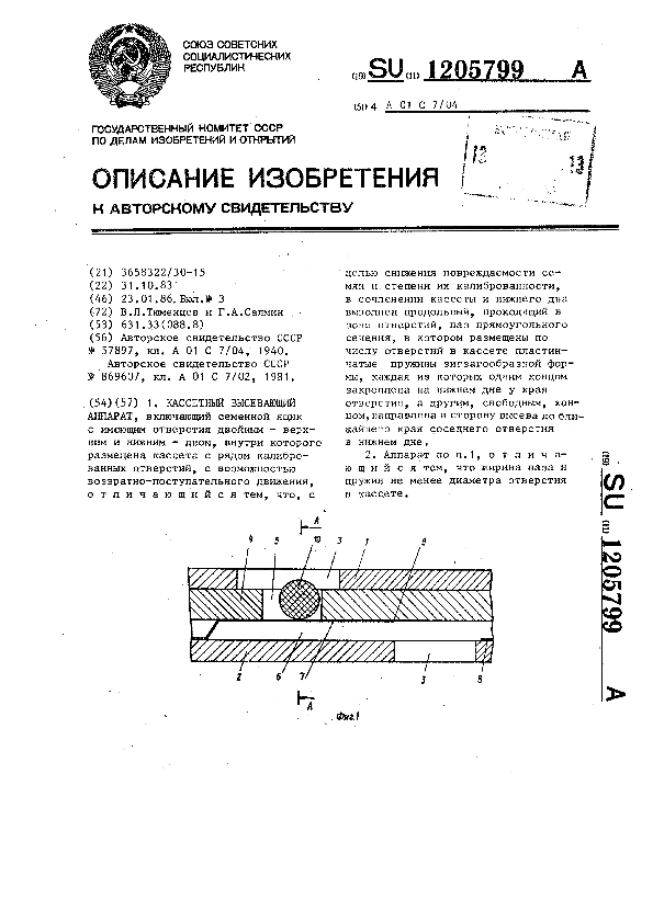 Кассетный высевающий аппарат / Тюменцев В. Л., Салмин Г. А. // Описания изобретений (ретрофонд) / Комитет по патентам и товарным знакам России. – М., 2003. – 1986, № 1. — (Патенты России). — Загл. с титул. экрана. — Поисковая система: ИПС MIMOSA GTI. — Систем. требования: Acrobat Reader. — Режим доступа: ftp://smolensklib.ru/bd/patent_ru/pt1205799.pdf. — <URL:ftp://smolensklib.ru/bd/patent_ru/pt1205799.pdf>.