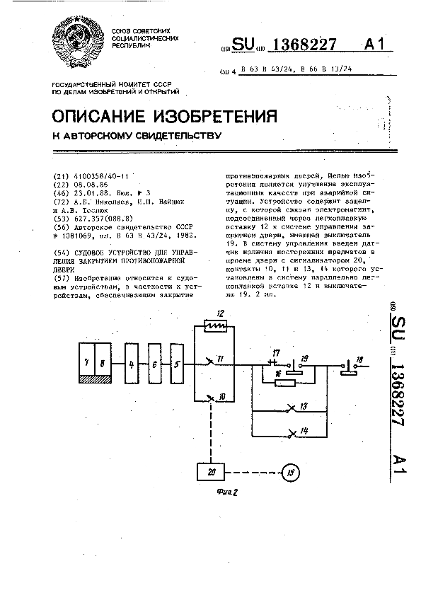Судовое устройство для управления закрытием противопожарной двери / Николаев А. Б., Найдюк П. П., Теслюк А. В. // Описания изобретений (ретрофонд) / Комитет по патентам и товарным знакам России. — М., 1994-____. — (Патенты России). – 1988, № 1. — Загл. с титул. экрана. — Поисковая система: ИПС MIMOSA GTI. — Систем. требования: Acrobat Reader. — Режим доступа: ftp://smolensklib.ru/bd/patent_ru/pt1368227.pdf. — <URL:ftp://smolensklib.ru/bd/patent_ru/pt1368227.pdf>.