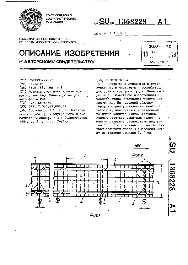 Корпус судна / Соколов Я. А.; заявитель: Астраханское центральное конструкторское бюро Министерства речного флота РСФСР // Описания изобретений (ретрофонд) / Комитет по патентам и товарным знакам России. — М., 1994-____. — (Патенты России). – 1988, № 1. — Загл. с титул. экрана. — Поисковая система: ИПС MIMOSA GTI. — Систем. требования: Acrobat Reader. — Режим доступа: ftp://smolensklib.ru/bd/patent_ru/pt1368228.pdf. — <URL:ftp://smolensklib.ru/bd/patent_ru/pt1368228.pdf>.