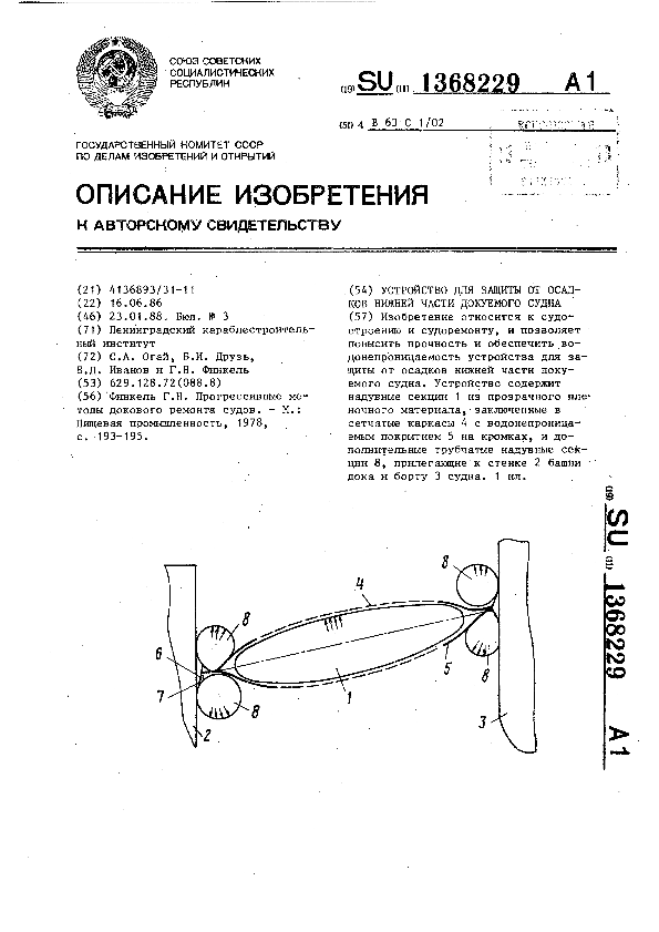 Устройство для защиты от осадков нижней части докуемого судна / Огай С. А., Друзь Б. И., Иванов Б. Д., Финкель Г. Н.; заявитель: Ленинградский караблестроительный институт // Описания изобретений (ретрофонд) / Комитет по патентам и товарным знакам России. — М., 1994-____. — (Патенты России). – 1988, № 1. — Загл. с титул. экрана. — Поисковая система: ИПС MIMOSA GTI. — Систем. требования: Acrobat Reader. — Режим доступа: ftp://smolensklib.ru/bd/patent_ru/pt1368229.pdf. — <URL:ftp://smolensklib.ru/bd/patent_ru/pt1368229.pdf>.