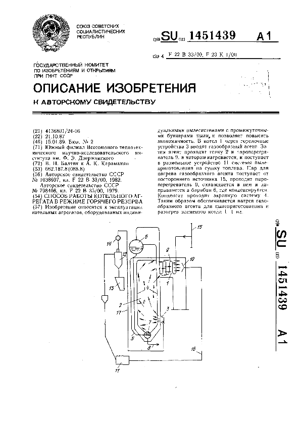 Способ работы котельного агрегата в режиме горячего резерва / Балтян В. Н., Караманян А. К.; заявитель: Южный филиал Всесоюзного теплотехнического научно-исследовательского института им. Ф. Э. Дзержинского // Описания изобретений (ретрофонд) / Комитет по патентам и товарным знакам России. – М., 2003. – 1989, № 1. — (Патенты России). — Загл. с титул. экрана. — Поисковая система: ИПС MIMOSA GTI. — Систем. требования: Acrobat Reader. — Режим доступа: ftp://smolensklib.ru/bd/patent_ru/pt1451439.pdf. — <URL:ftp://smolensklib.ru/bd/patent_ru/pt1451439.pdf>.