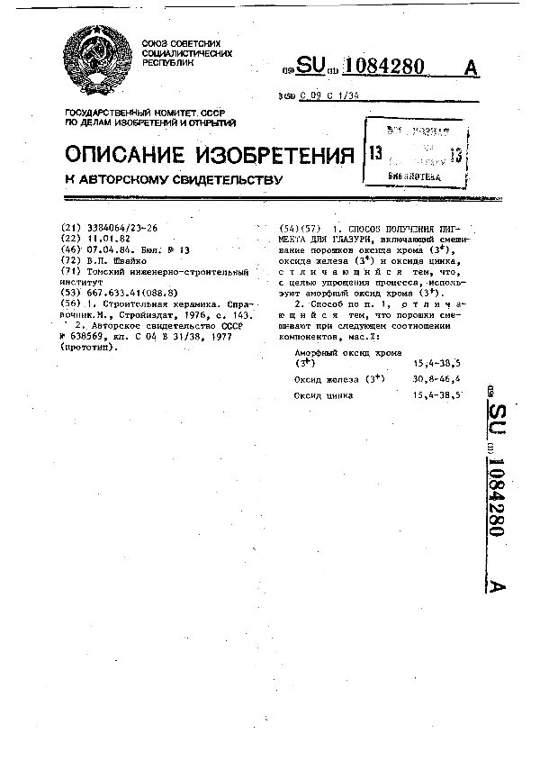 Состав получения пигмента для глазури / Швайко В. П.; заявитель : Томский инженерно-строительный институт // Описания изобретений (ретрофонд) / Комитет по патентам и товарным знакам России. – М. — (Патенты России)., 2003. – 1984, № 1. — Загл. с титул. экрана. — Поисковая система: ИПС MIMOSA GTI. — Систем. требования: Acrobat Reader. — Режим доступа: ftp://smolensklib.ru/bd/patent_ru/pt1084280.pdf. — <URL:ftp://smolensklib.ru/bd/patent_ru/pt1084280.pdf>.