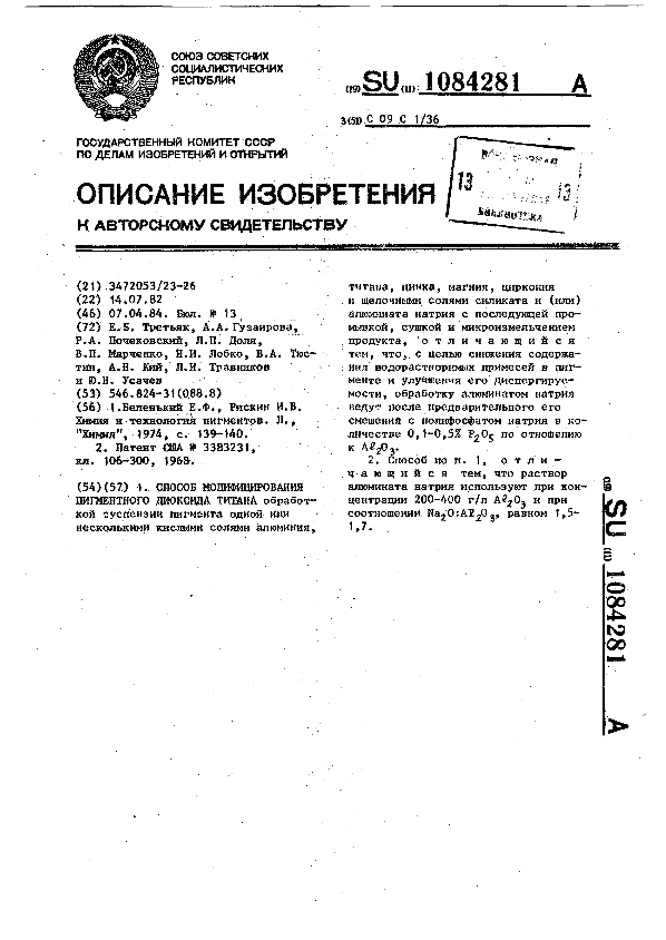 Состав модифицирования пигментного диоксида титана / Третьяк Е. Б., Гузаирова А. А., Почековский Р. А. [и др.] // Описания изобретений (ретрофонд) / Комитет по патентам и товарным знакам России. – М. — (Патенты России)., 2003. – 1984, № 1. — Загл. с титул. экрана. — Поисковая система: ИПС MIMOSA GTI. — Систем. требования: Acrobat Reader. — Режим доступа: ftp://smolensklib.ru/bd/patent_ru/pt1084281.pdf. — <URL:ftp://smolensklib.ru/bd/patent_ru/pt1084281.pdf>.
