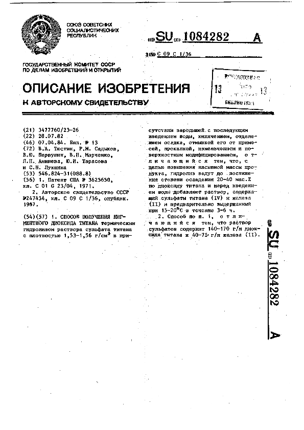 Способ получения пигментного диоксида титана / Тюстин В. А., Садыков Р. М., Первушин В. Ю. [и др.] // Описания изобретений (ретрофонд) / Комитет по патентам и товарным знакам России. – М. — (Патенты России)., 2003. – 1984, № 1. — Загл. с титул. экрана. — Поисковая система: ИПС MIMOSA GTI. — Систем. требования: Acrobat Reader. — Режим доступа: ftp://smolensklib.ru/bd/patent_ru/pt1084282.pdf. — <URL:ftp://smolensklib.ru/bd/patent_ru/pt1084282.pdf>.