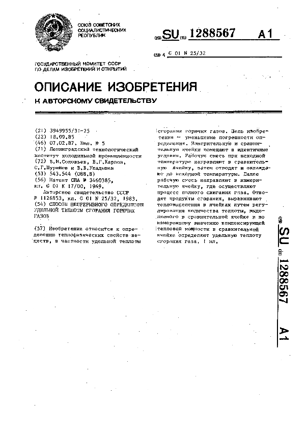 Способ непрерывного определения удельной теплоты сгорания горючих газов / Соловьев В. И., Карпов В. Г., Шуринов С. Г., Упадышев В. В.; заявитель: Ленинградский технологический институт холодильной промышленности // Описания изобретений (ретрофонд) / Комитет по патентам и товарным знакам России. – М., 2003. – 1987, № 1. — (Патенты России). — Загл. с титул. экрана. — Поисковая система: MIMOSA GTI. — Систем. требования: Acrobat Reader. — Режим доступа: ftp://smolensklib.ru/bd/patent_ru/pt1288567.pdf. — <URL:ftp://smolensklib.ru/bd/patent_ru/pt1288567.pdf>.