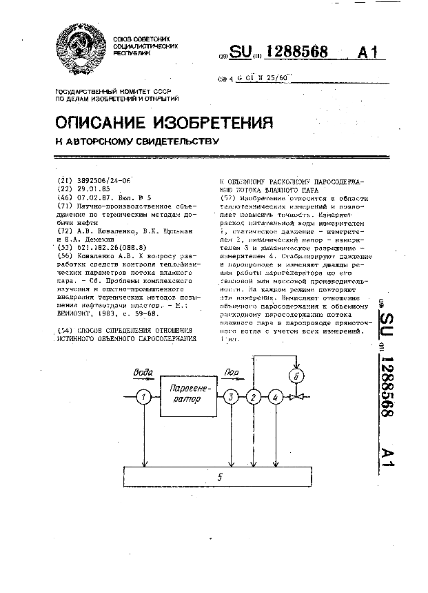 Способ определения отношения истинного объемного паросодержания к объемному расходному паросодержанию потока влажного пара / Коваленко А. В., Шульман Б. Х., Демехин Е. А.; заявитель: Научно-производственное объединение по термическим методам добычи нефти // Описания изобретений (ретрофонд) / Комитет по патентам и товарным знакам России. – М., 2003. – 1987, № 1. — (Патенты России). — Загл. с титул. экрана. — Поисковая система: MIMOSA GTI. — Систем. требования: Acrobat Reader. — Режим доступа: ftp://smolensklib.ru/bd/patent_ru/pt1288568.pdf. — <URL:ftp://smolensklib.ru/bd/patent_ru/pt1288568.pdf>.