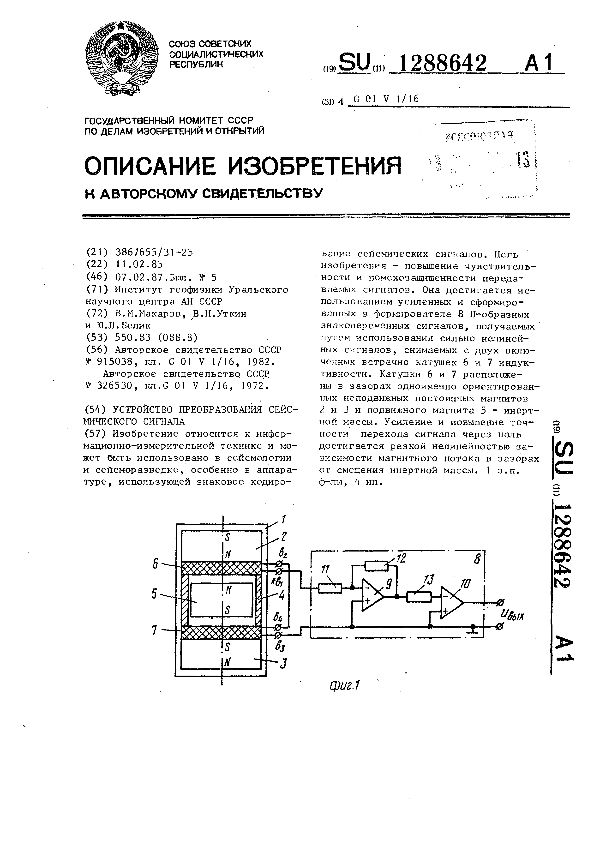 Устройство преобразования сейсмического сигнала / Макаров В. М., Уткин В. И., Белик Ю. Л.; заявитель: Институт геофизики Уральского научного центра АН СССР // Описания изобретений (ретрофонд) / Комитет по патентам и товарным знакам России. – М., 2003. – 1987, № 1. — (Патенты России). — Загл. с титул. экрана. — Систем. требования: Acrobat Reader. — Режим доступа: ftp://smolensklib.ru/bd/patent_ru/pt1288642.pdf. — <URL:ftp://smolensklib.ru/bd/patent_ru/pt1288642.pdf>.