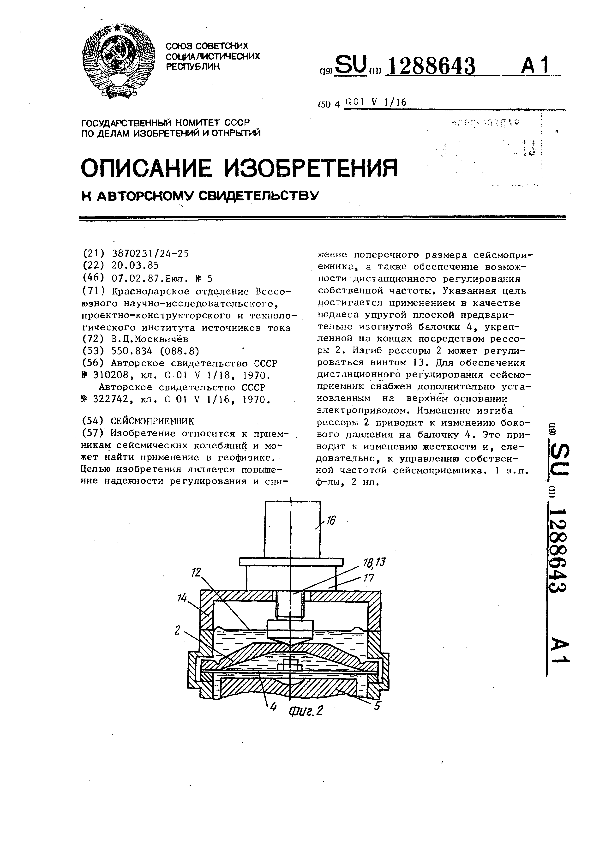 Сейсмоприемник / Москвичев В. Д.; заявитель: Краснодарское отделение Всесоюзного научно-исследовательского, проектно-конструкторского и технологического института источников тока // Описания изобретений (ретрофонд) / Комитет по патентам и товарным знакам России. – М., 2003. – 1987, № 1. — (Патенты России). — Загл. с титул. экрана. — Систем. требования: Acrobat Reader. — Режим доступа: ftp://smolensklib.ru/bd/patent_ru/pt1288643.pdf. — <URL:ftp://smolensklib.ru/bd/patent_ru/pt1288643.pdf>.
