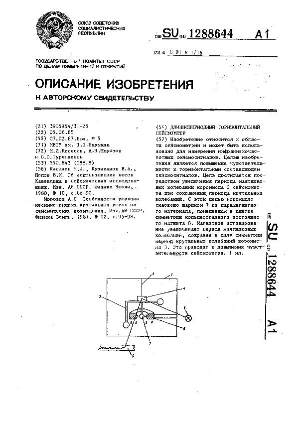 Длиннопериодный горизонтальный сейсмометр / Киселев М. И., Морозов А. Н., Турчанинов С. О.; заявитель: МВТУ им. Н. Э. Баумана // Описания изобретений (ретрофонд) / Комитет по патентам и товарным знакам России. – М., 2003. – 1987, № 1. — (Патенты России). — Загл. с титул. экрана. — Систем. требования: Acrobat Reader. — Режим доступа: ftp://smolensklib.ru/bd/patent_ru/pt1288644.pdf. — <URL:ftp://smolensklib.ru/bd/patent_ru/pt1288644.pdf>.
