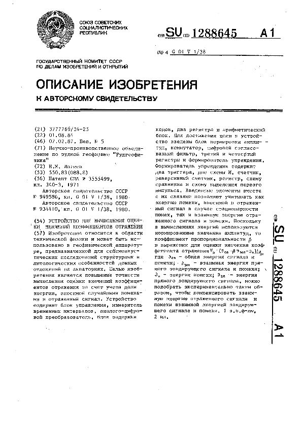 Устройство для вычисления оценки значений коэффициентов отражения / Шагиев Н. М.; заявитель: Научно-производственное объединение по рудной геофизике "Рудгеофизика" // Описания изобретений (ретрофонд) / Комитет по патентам и товарным знакам России. – М., 2003. – 1987, № 1. — (Патенты России). — Загл. с титул. экрана. — Систем. требования: Acrobat Reader. — Режим доступа: ftp://smolensklib.ru/bd/patent_ru/pt1288645.pdf. — <URL:ftp://smolensklib.ru/bd/patent_ru/pt1288645.pdf>.