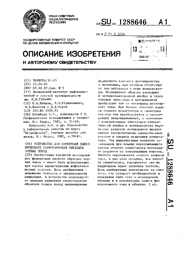 Устройство для измерения электрического сопротивления образцов горных пород / Нейман Е. А., Стрельченко В. В., Бекетов В. В., Журов Д. А.; заявитель: Московский институт нефтехимической и газовой промышленности им. И. М. Губкина // Описания изобретений (ретрофонд) / Комитет по патентам и товарным знакам России. – М., 2003. – 1987, № 1. — (Патенты России). — Загл. с титул. экрана. — Систем. требования: Acrobat Reader. — Режим доступа: ftp://smolensklib.ru/bd/patent_ru/pt1288646.pdf. — <URL:ftp://smolensklib.ru/bd/patent_ru/pt1288646.pdf>.
