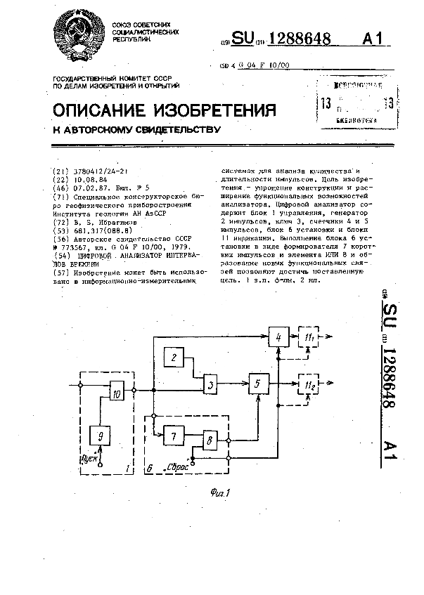Цифровой анализатор интервалов времени / Ибрагимов В. Б.; заявитель: Специальное конструкторское бюро геофизического приборостроения Института геологии АН АзССР // Описания изобретений (ретрофонд) / Комитет по патентам и товарным знакам России. – М., 2003. – 1987, № 1. — (Патенты России). — Загл. с титул. экрана. — Систем. требования: Acrobat Reader. — Режим доступа: ftp://smolensklib.ru/bd/patent_ru/pt1288648.pdf. — <URL:ftp://smolensklib.ru/bd/patent_ru/pt1288648.pdf>.