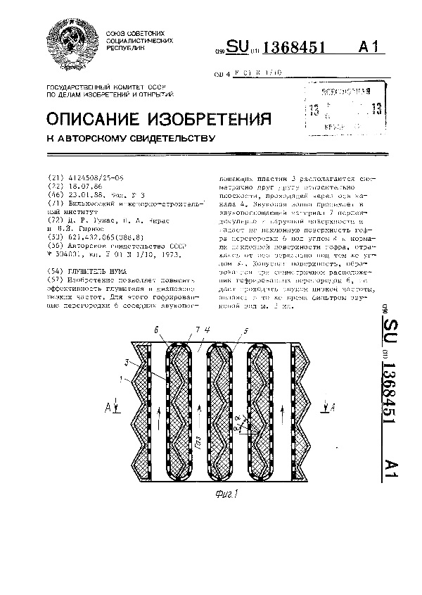 Глушитель шума / Гужас Д. Р., Чирас П. А., Гирнюс В. Й.; заявитель: Вильнюсский инженерно-строительный институт // Описания изобретений (ретрофонд) / Комитет по патентам и товарным знакам России. — М., 1994-____. — (Патенты России). – 1988, № 1. — Загл. с титул. экрана. — Поисковая система: ИПС MIMOSA GTI. — Систем. требования: Acrobat Reader. — Режим доступа: ftp://smolensklib.ru/bd/patent_ru/pt1368451.pdf. — <URL:ftp://smolensklib.ru/bd/patent_ru/pt1368451.pdf>.