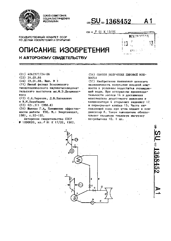 Способ получения пиковой мощности / Баранов С. А., Капелович Д. Б., Харабаджи В. М.; заявитель: Южный филиал Всесоюзного теплотехнического научно-исследовательского института им. Ф. Э. Дзержинского // Описания изобретений (ретрофонд) / Комитет по патентам и товарным знакам России. — М., 1994-____. — (Патенты России). – 1988, № 1. — Загл. с титул. экрана. — Поисковая система: ИПС MIMOSA GTI. — Систем. требования: Acrobat Reader. — Режим доступа: ftp://smolensklib.ru/bd/patent_ru/pt1368452.pdf. — <URL:ftp://smolensklib.ru/bd/patent_ru/pt1368452.pdf>.