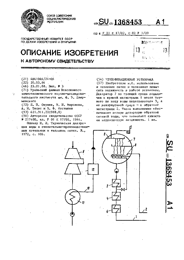 Теплофикационная установка / Окунев Л. П., Миронова Н. И., Тесис А. М., Костылев В. Ф.; заявитель: Уральский филиал Всесоюзного теплотехнического научно-исследовательского института им. Ф. Э. Дзержинского // Описания изобретений (ретрофонд) / Комитет по патентам и товарным знакам России. — М., 1994-____. — (Патенты России). – 1988, № 1. — Загл. с титул. экрана. — Поисковая система: ИПС MIMOSA GTI. — Систем. требования: Acrobat Reader. — Режим доступа: ftp://smolensklib.ru/bd/patent_ru/pt1368453.pdf. — <URL:ftp://smolensklib.ru/bd/patent_ru/pt1368453.pdf>.