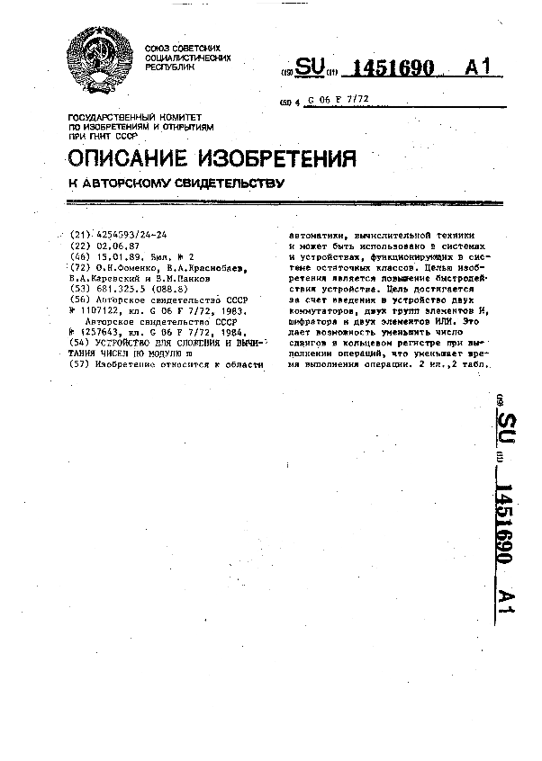 Устройство для сложения и вычитания чисел по модулю @ / Фоменко О. Н., Краснобаев В. А., Каревский В. А., Панков В. М. // Описания изобретений (ретрофонд) / Комитет по патентам и товарным знакам России. – М., 2003. – 1989, № 1. — (Патенты России). — Загл. с титул. экрана. — Систем. требования: Acrobat Reader. — Режим доступа: ftp://smolensklib.ru/bd/patent_ru/pt1451690.pdf. — <URL:ftp://smolensklib.ru/bd/patent_ru/pt1451690.pdf>.