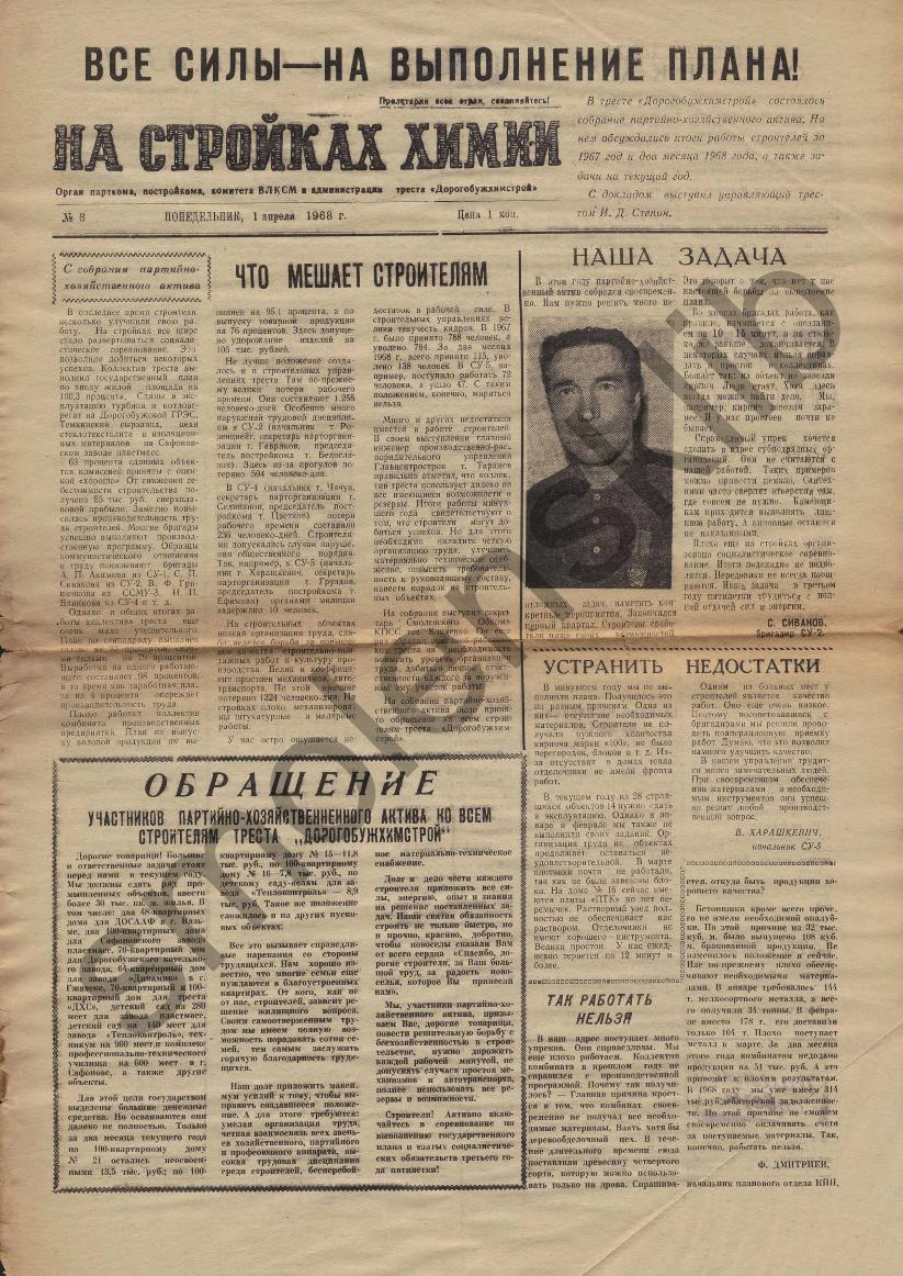 На стройках химии: Орган парткома, постройкома, комитета ВЛКСМ и администрации треста "Дорогобужхимстрой". — Сафоново: Сафоновская тип., 1967-____. № 8.