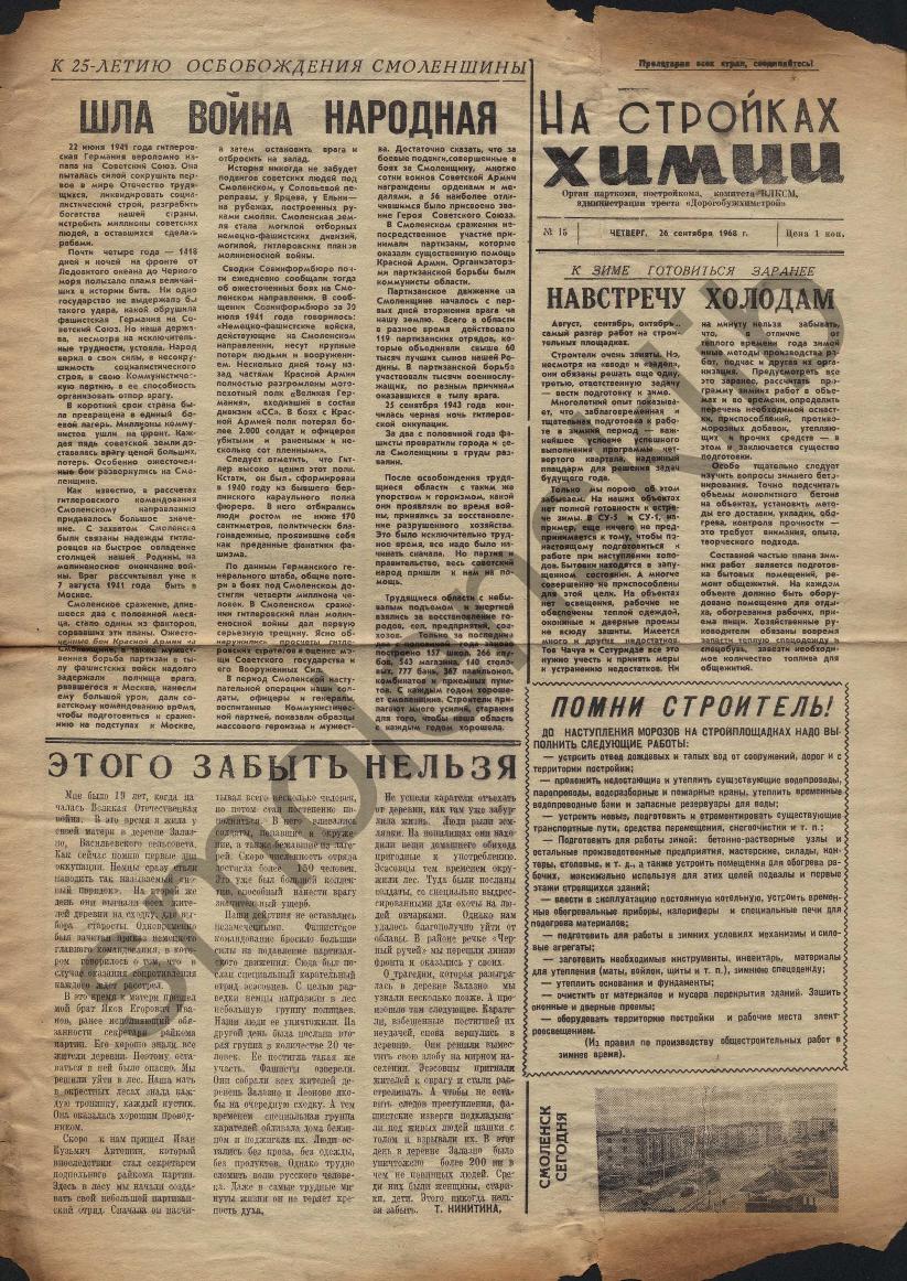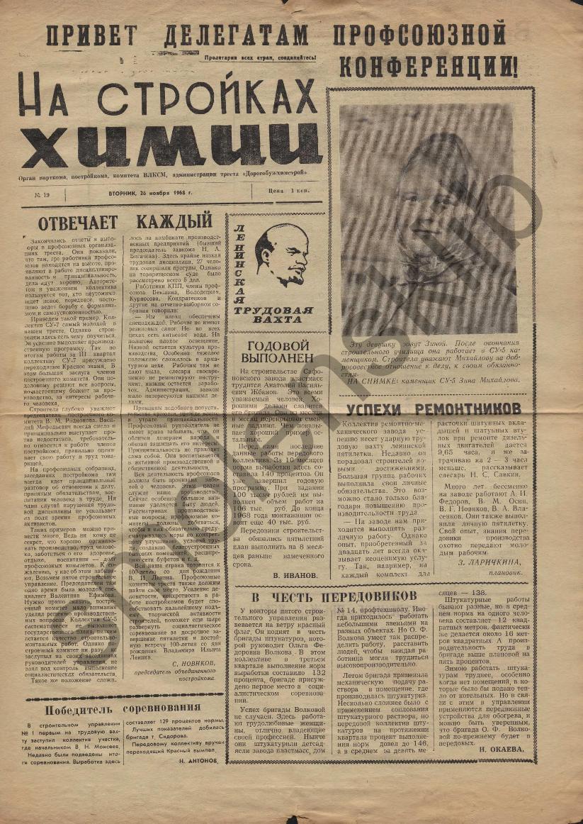 На стройках химии: Орган парткома, постройкома, комитета ВЛКСМ и администрации треста "Дорогобужхимстрой". — Сафоново: Сафоновская тип., 1967-____. № 19.