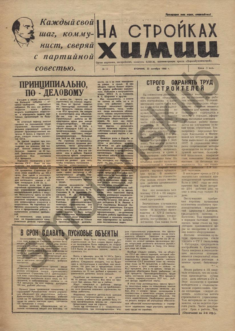 На стройках химии: Орган парткома, постройкома, комитета ВЛКСМ и администрации треста "Дорогобужхимстрой". — Сафоново: Сафоновская тип., 1967-____. № 17.