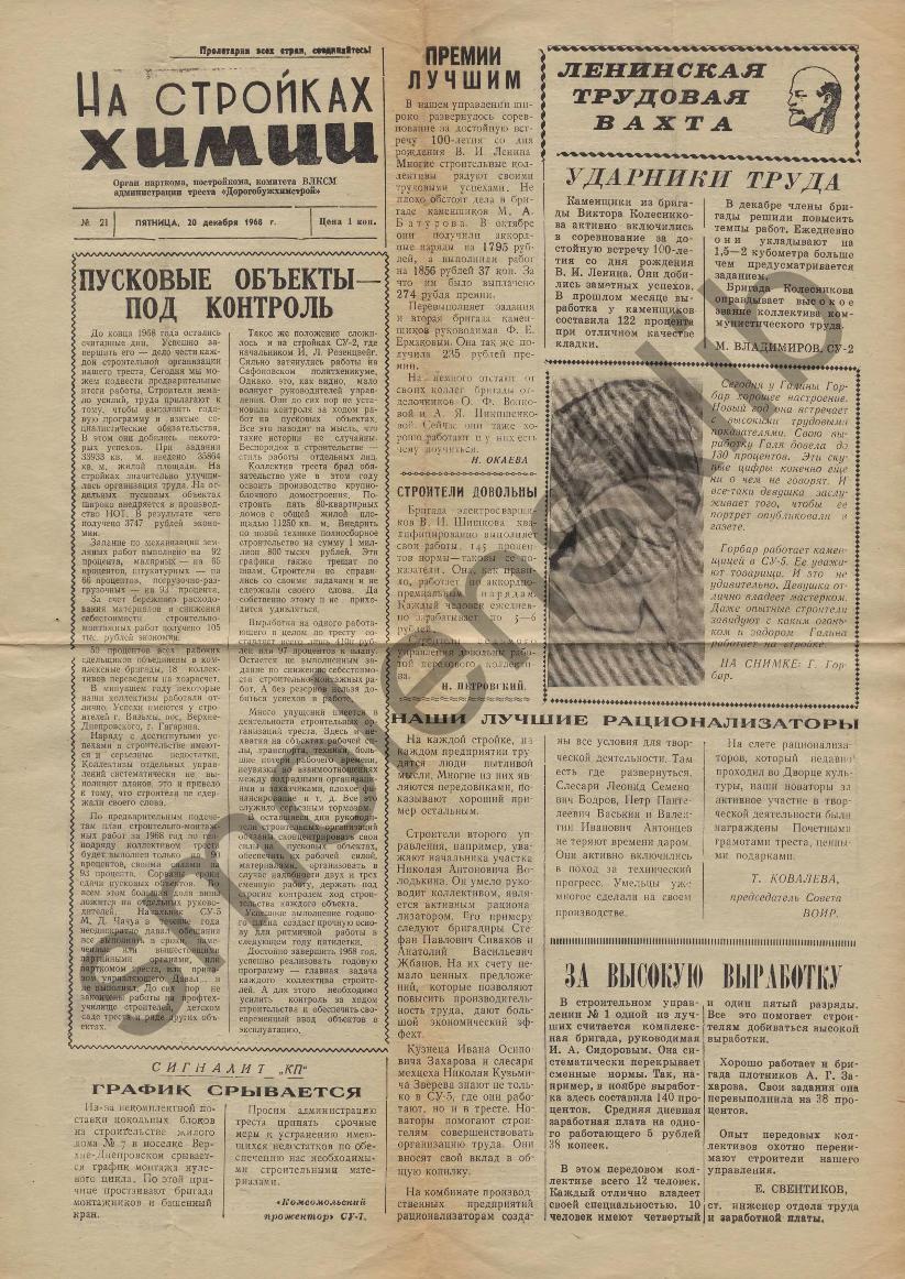 На стройках химии: Орган парткома, постройкома, комитета ВЛКСМ и администрации треста "Дорогобужхимстрой". — Сафоново: Сафоновская тип., 1967-____. № 21.