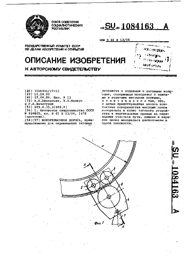 Монорельсовая дорога / Афанасьев А. А., Малкус Б. Л., Хачатуров Г. А. // Описания изобретений (ретрофонд) / Комитет по патентам и товарным знакам России. – М. — (Патенты России)., 2003. – 1984, № 1. — Загл. с титул. экрана. — Поисковая система: ИПС MIMOSA GTI. — Систем. требования: Acrobat Reader. — Режим доступа: ftp://smolensklib.ru/bd/patent_ru/pt1084163.pdf. — <URL:ftp://smolensklib.ru/bd/patent_ru/pt1084163.pdf>.