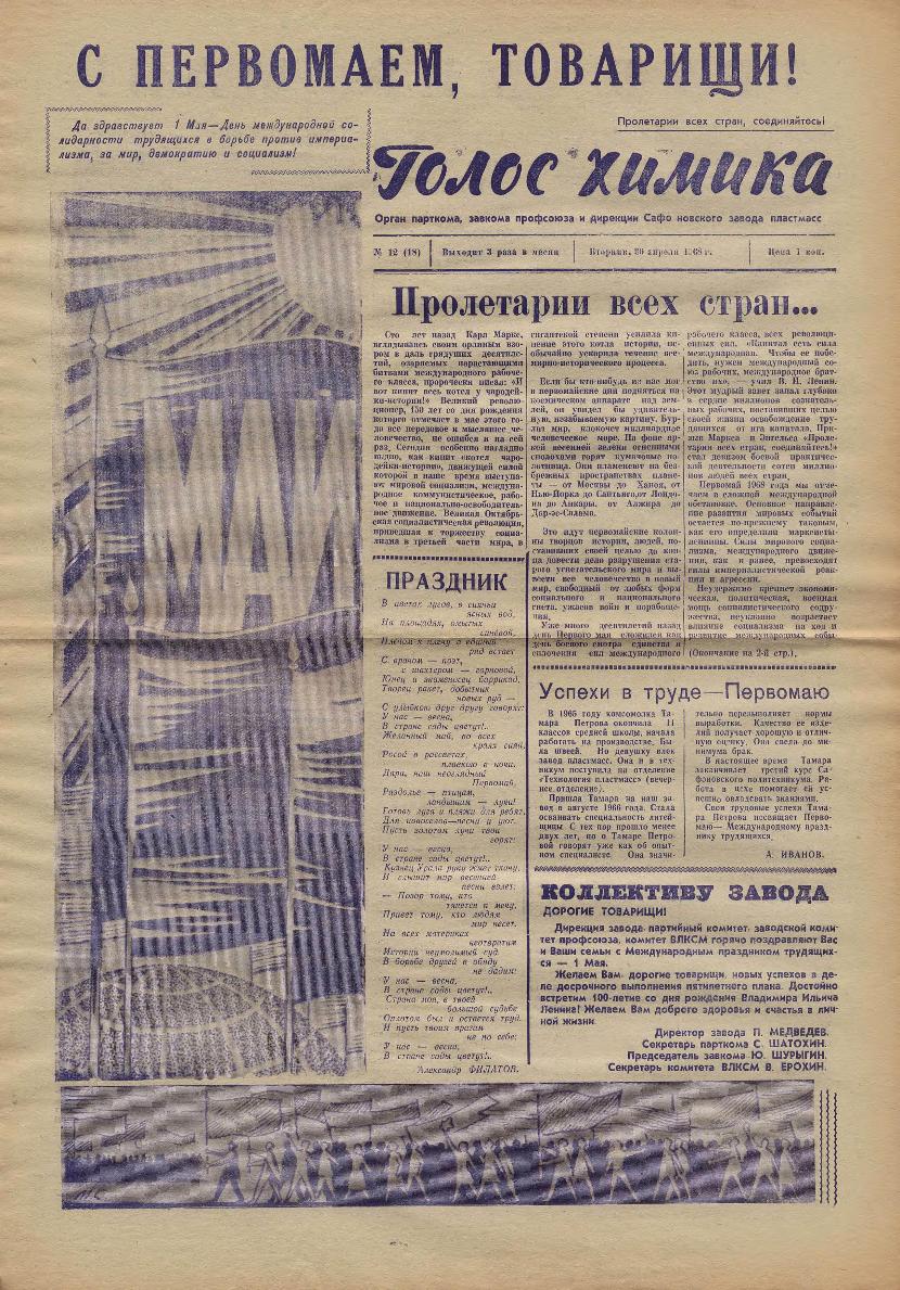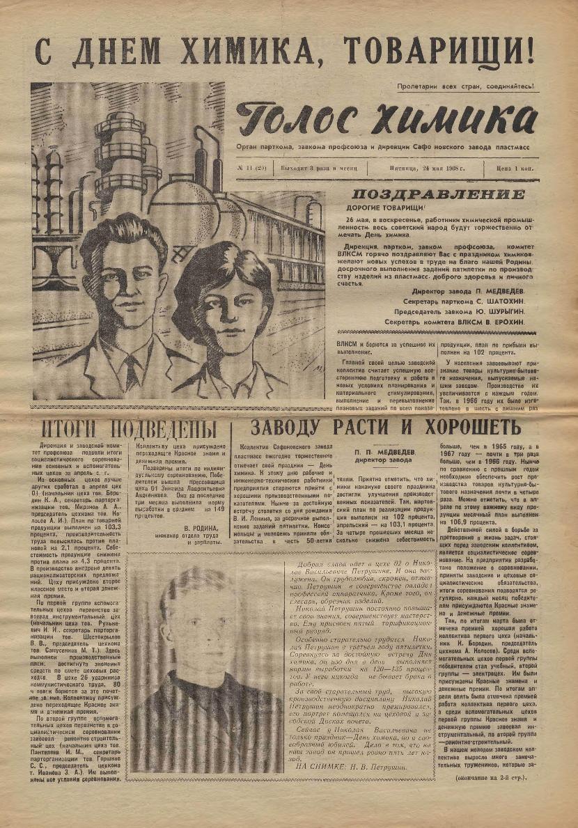 Голос химика: Орган парткома, завкома профсоюза и дирекции Сафоновского завода пластмасс. — Сафоново: Сафонов. тип. Смолоблуправ., 1966-____. № 19.
