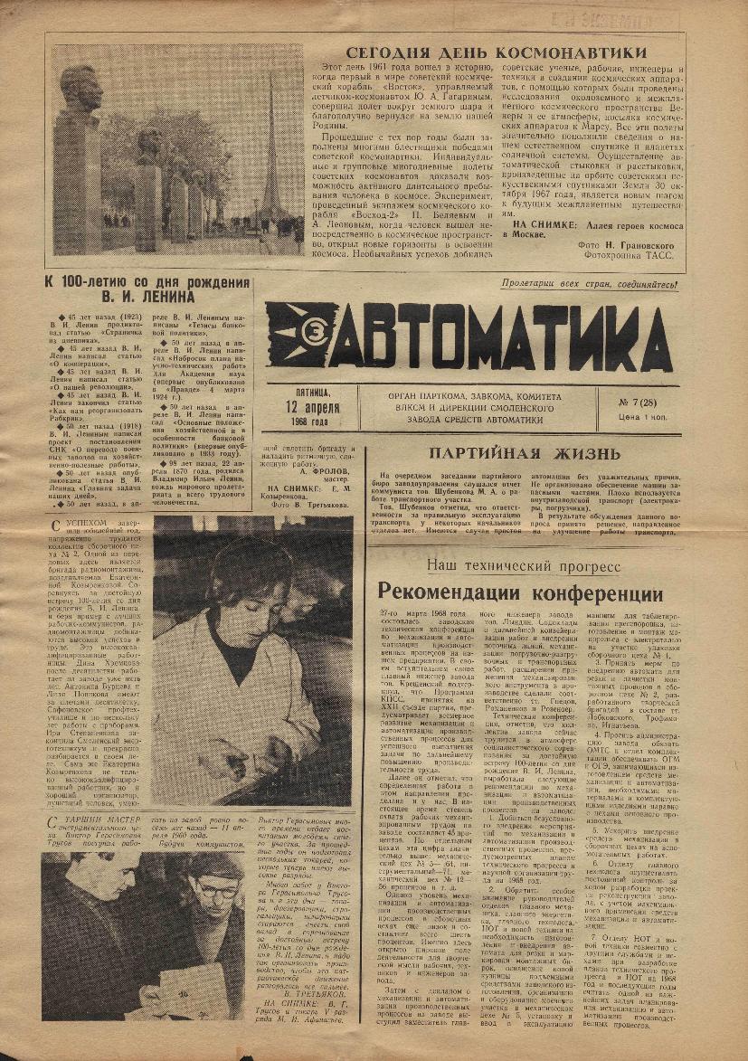Автоматика: Орган парткома, завкома, комитета ВЛКСМ и дирекции Смоленского завода средств автоматики. — Смоленск: Смолгортип., 1967-____. № 7.