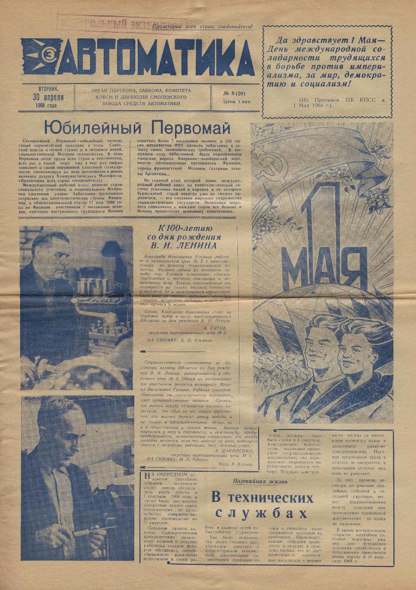 Автоматика: Орган парткома, завкома, комитета ВЛКСМ и дирекции Смоленского завода средств автоматики. — Смоленск: Смолгортип., 1967-____. № 8.