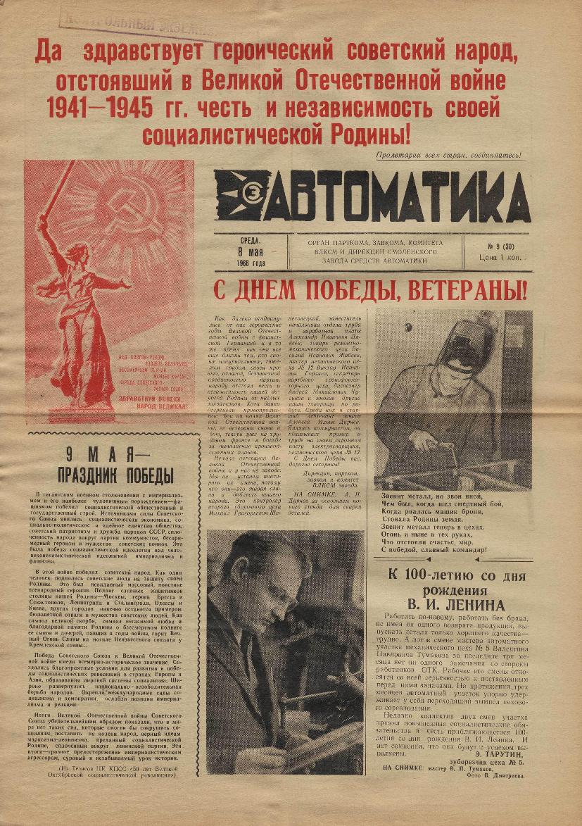 Автоматика: Орган парткома, завкома, комитета ВЛКСМ и дирекции Смоленского завода средств автоматики. — Смоленск: Смолгортип., 1967-____. № 9.
