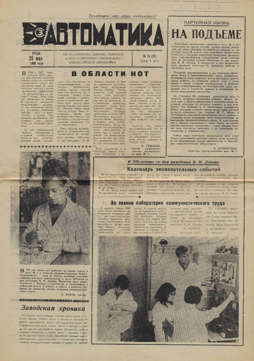 Автоматика: Орган парткома, завкома, комитета ВЛКСМ и дирекции Смоленского завода средств автоматики. — Смоленск: Смолгортип., 1967-____. № 10.