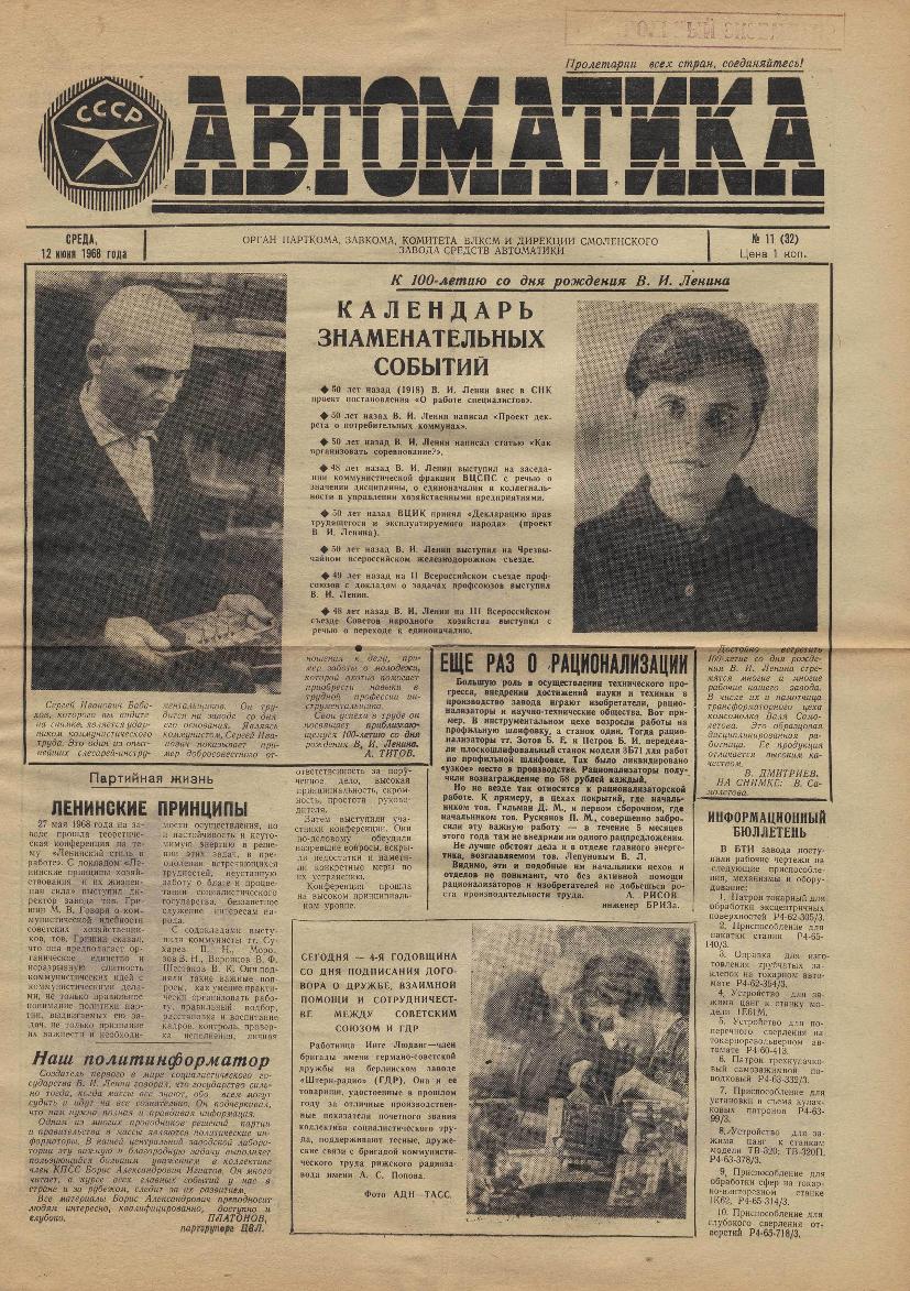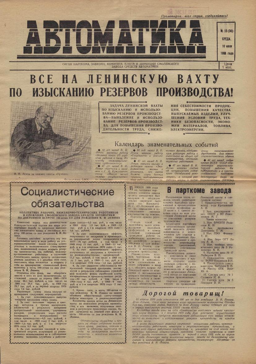 Автоматика: Орган парткома, завкома, комитета ВЛКСМ и дирекции Смоленского завода средств автоматики. — Смоленск: Смолгортип., 1967-____. № 13.