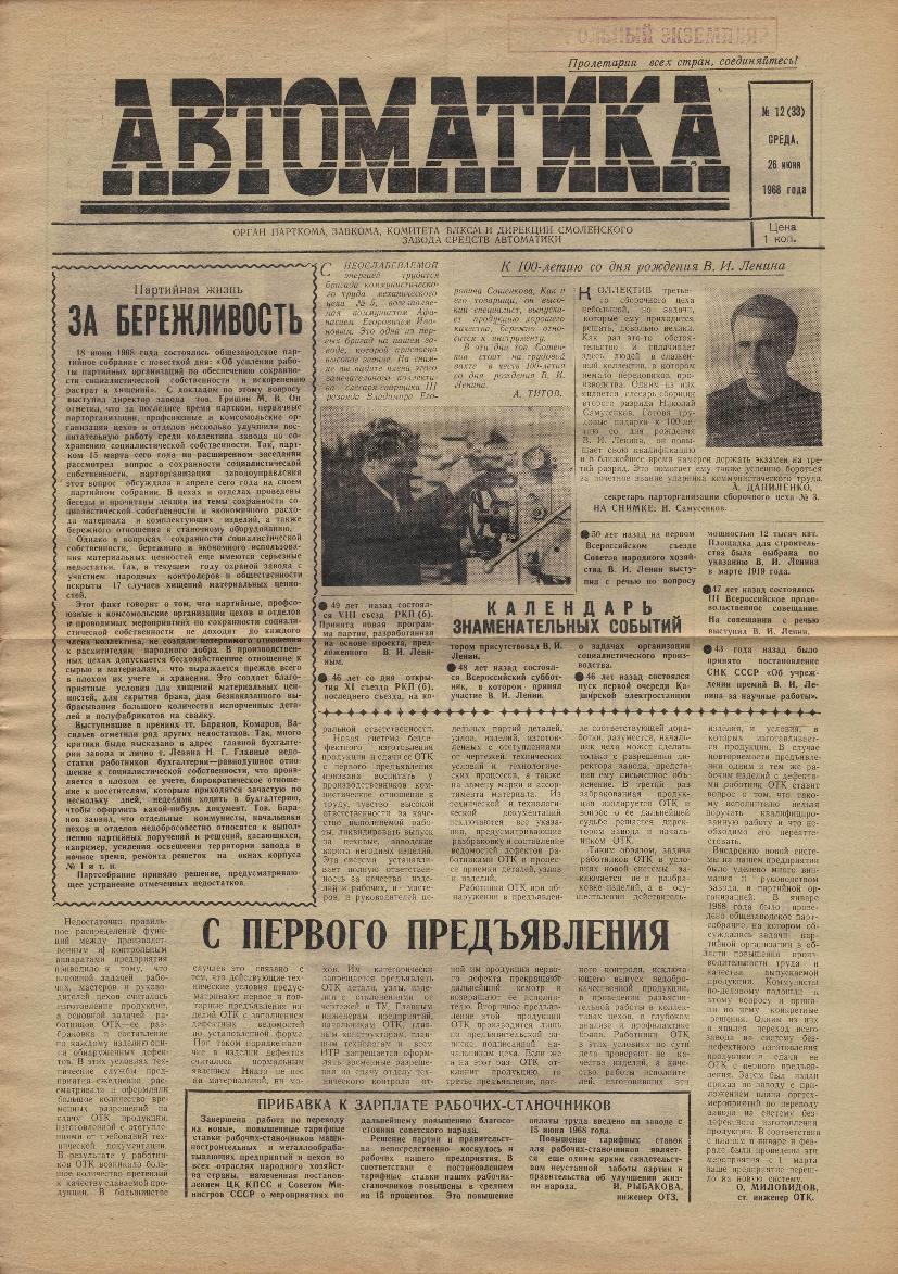 Автоматика: Орган парткома, завкома, комитета ВЛКСМ и дирекции Смоленского завода средств автоматики. — Смоленск: Смолгортип., 1967-____. № 12.