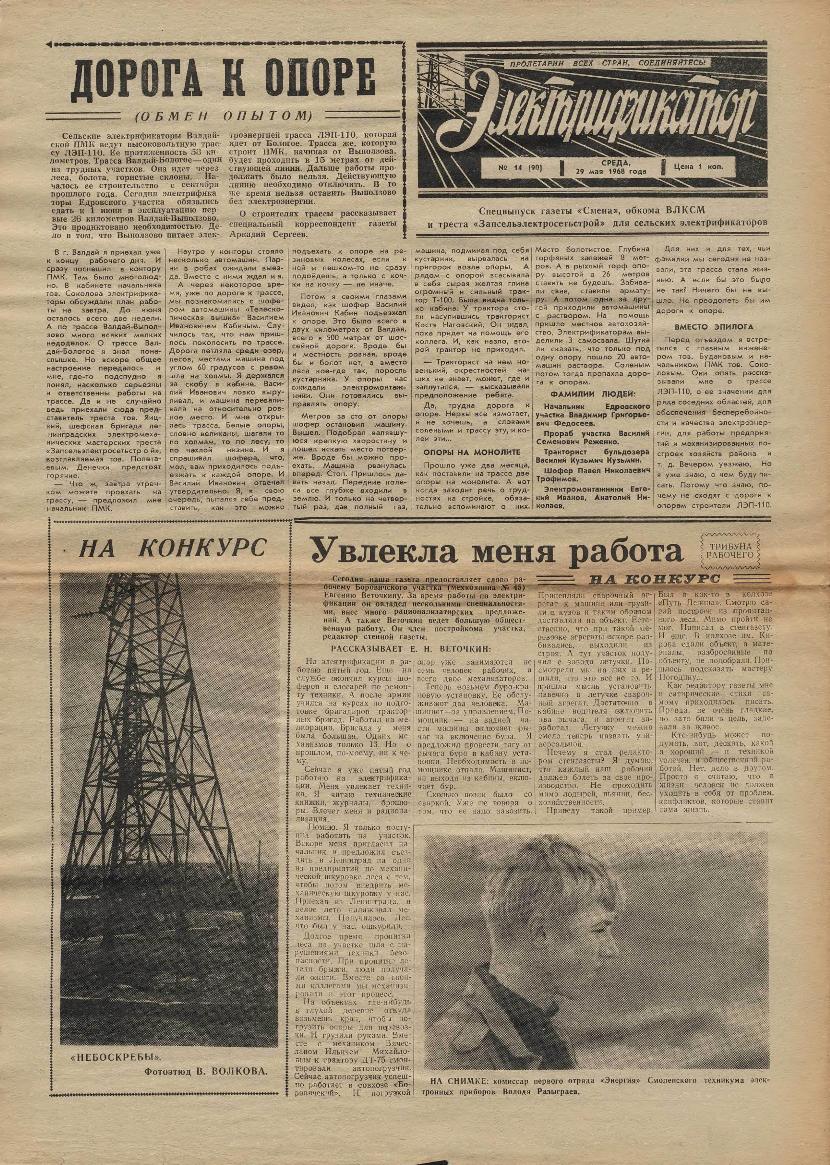 Электрификатор: Спецвыпуск газеты "Смена" - и треста "Запсельэлектросетьстрой" для сельских электрификаторов. — Смоленск: Тип. им. Смирнова, 1965-____. № 14.