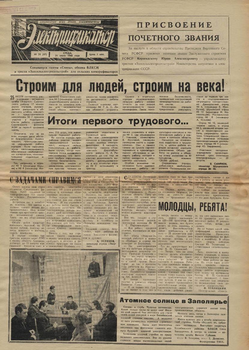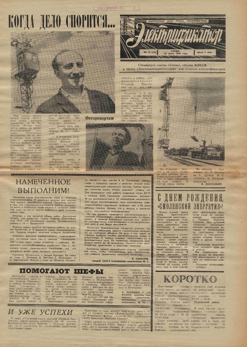 Электрификатор: Спецвыпуск газеты "Смена" - и треста "Запсельэлектросетьстрой" для сельских электрификаторов. — Смоленск: Тип. им. Смирнова, 1965-____. № 20.