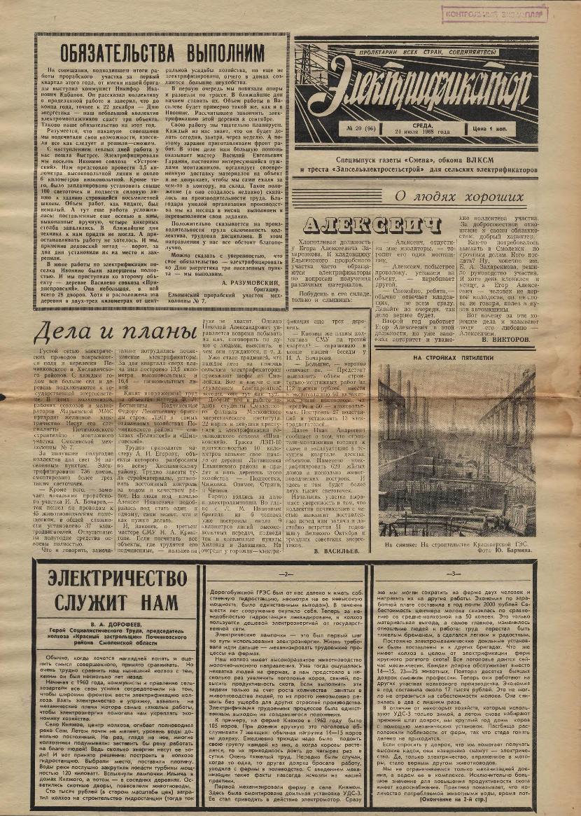 Электрификатор: Спецвыпуск газеты "Смена" - и треста "Запсельэлектросетьстрой" для сельских электрификаторов. — Смоленск: Тип. им. Смирнова, 1965-____. № 21.