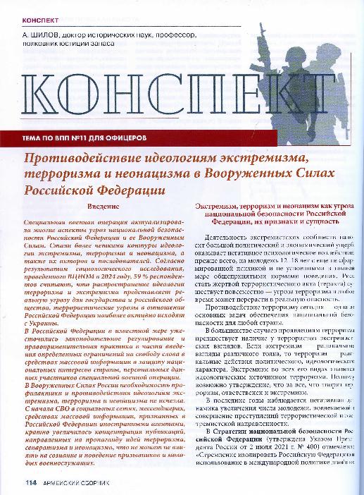Шилов, А. Противодействие идеологиям экстремизма, терроризма и неонацизма в Вооруженных Силах Российской Федерации: тема по ВПП № 11 для офицеров / А. Шилов // Армейский сборник / М-во обороны РФ; гл. ред. О. З. Скира. – Москва, 2025. – № 8. — (Конспект). — <URL:ftp://smolensklib.ru/bd/mir_bez_nac/bn000016.pdf>.