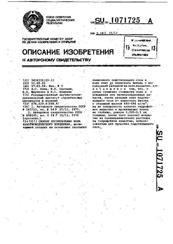 Способ изготовления пола животноводческого помещения / Боев И. С., Удачкин И. Б., Марченко В. И., Федянин В. С.; заявитель: Государственный научно-исследовательский институт строительных материалов и изделий // Описания изобретений (ретрофонд) / Комитет по патентам и товарным знакам России. – М. — (Патенты России)., 2003. – 1984, № 1. — Загл. с титул. экрана. — Поисковая система: ИПС MIMOSA GTI. — Систем. требования: Acrobat Reader. — Режим доступа: ftp://smolensklib.ru/bd/patent_ru/pt1071725.pdf. — <URL:ftp://smolensklib.ru/bd/patent_ru/pt1071725.pdf>.