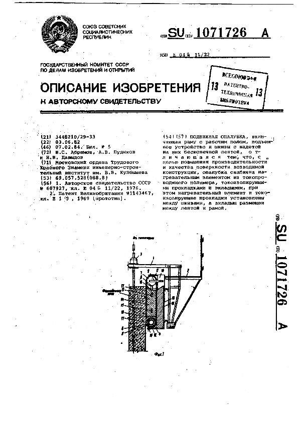 Подвижная опалубка / Абрамов В. С., Пудиков А. В., Давыдов И. В.; заявитель: Московский ордена Трудового Красного Знамени инженерно-строительный институт им. В. В. Куйбышева // Описания изобретений (ретрофонд) / Комитет по патентам и товарным знакам России. – М. — (Патенты России)., 2003. – 1984, № 1. — Загл. с титул. экрана. — Поисковая система: ИПС MIMOSA GTI. — Систем. требования: Acrobat Reader. — Режим доступа: ftp://smolensklib.ru/bd/patent_ru/pt1071726.pdf. — <URL:ftp://smolensklib.ru/bd/patent_ru/pt1071726.pdf>.
