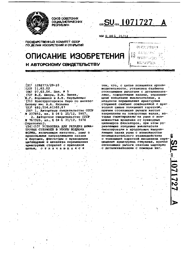 Установка для укладки арматурных стержней в упоры поддона / Шварц В. Д., Змеев Б. М., Боровиков В. Г., Мартыненко А. В.; заявитель: Конструкторское бюро по железобетону им. А. А. Якушева // Описания изобретений (ретрофонд) / Комитет по патентам и товарным знакам России. – М. — (Патенты России)., 2003. – 1984, № 1. — Загл. с титул. экрана. — Поисковая система: ИПС MIMOSA GTI. — Систем. требования: Acrobat Reader. — Режим доступа: ftp://smolensklib.ru/bd/patent_ru/pt1071727.pdf. — <URL:ftp://smolensklib.ru/bd/patent_ru/pt1071727.pdf>.