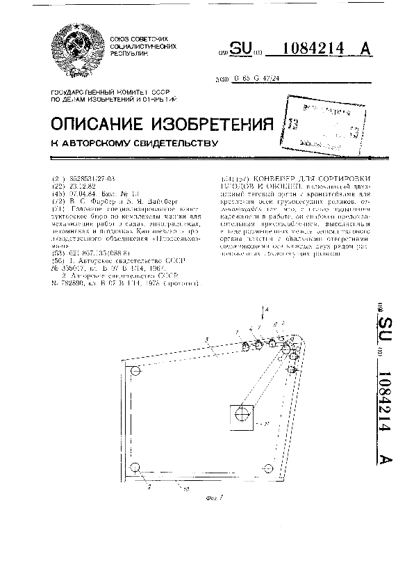 Конвейер для сортировки плодов и овощей / Фарбер В. С., Вайнберг Б. Я.; заявитель : Головное специализированное конструкторское бюро по комплексам машин для механизации работ в садах, виноградниках, питомниках и ягодниках Кишиневского производственного объединения «Плодседьхозмаш» // Описания изобретений (ретрофонд) / Комитет по патентам и товарным знакам России. – М. — (Патенты России)., 2003. – 1984, № 1. — Загл. с титул. экрана. — Поисковая система: ИПС MIMOSA GTI. — Систем. требования: Acrobat Reader. — Режим доступа: ftp://smolensklib.ru/bd/patent_ru/pt1084214.pdf. — <URL:ftp://smolensklib.ru/bd/patent_ru/pt1084214.pdf>.