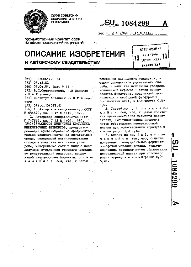 Способ получения комплекса внеклеточных ферментов / Семйчаевский В. Д., Даниляк Н. И., Трутнева И. А.; заявитель : Институт ботаники им. Н. Г. Холодного // Описания изобретений (ретрофонд) / Комитет по патентам и товарным знакам России. – М. — (Патенты России)., 2003. – 1984, № 1. — Загл. с титул. экрана. — Поисковая система: ИПС MIMOSA GTI. — Систем. требования: Acrobat Reader. — Режим доступа: ftp://smolensklib.ru/bd/patent_ru/pt1084299.pdf. — <URL:ftp://smolensklib.ru/bd/patent_ru/pt1084299.pdf>.