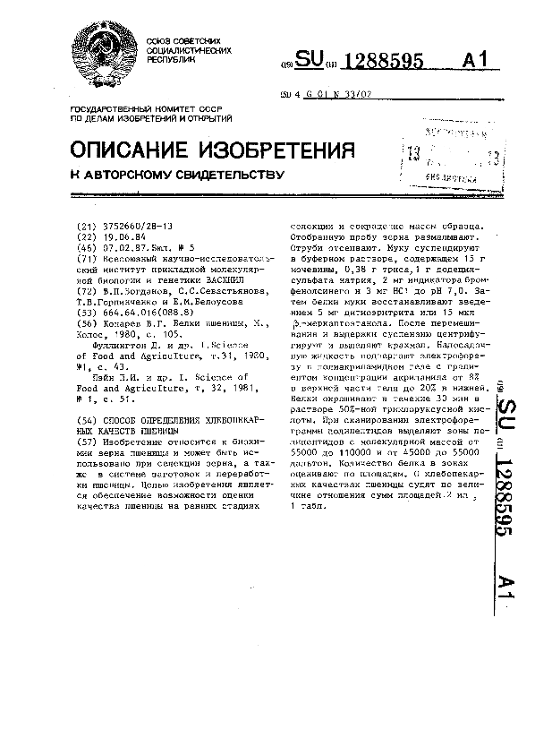 Способ определения хлебопекарных качеств пшеницы / Богданов В. П., Севастьянова С. С., Горпинченко Т. В., Белоусова Е. М.; заявитель: Всесоюзный научно-исследовательский институт прикладной молекулярной биологии и генетики ВАСХНИЛ // Описания изобретений (ретрофонд) / Комитет по патентам и товарным знакам России. – М., 2003. – 1987, № 1. — (Патенты России). — Загл. с титул. экрана. — Поисковая система: MIMOSA GTI. — Систем. требования: Acrobat Reader. — Режим доступа: ftp://smolensklib.ru/bd/patent_ru/pt1288595.pdf. — <URL:ftp://smolensklib.ru/bd/patent_ru/pt1288595.pdf>.