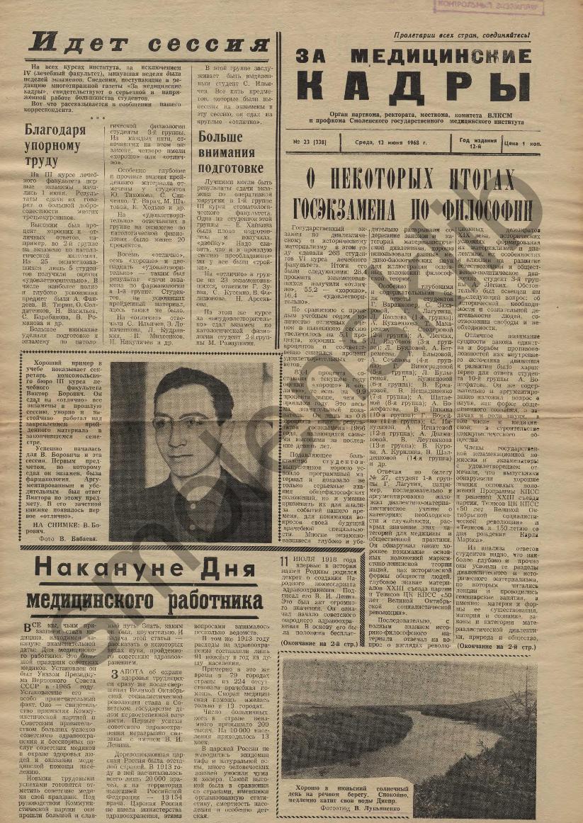 За медицинские кадры: Орган парткома, ректората, месткома, комитета ВЛКСМ и профкома Смоленского государственного медицинского института. — Смоленск: Тип. им. Смирнова, 1957-____. № 23.