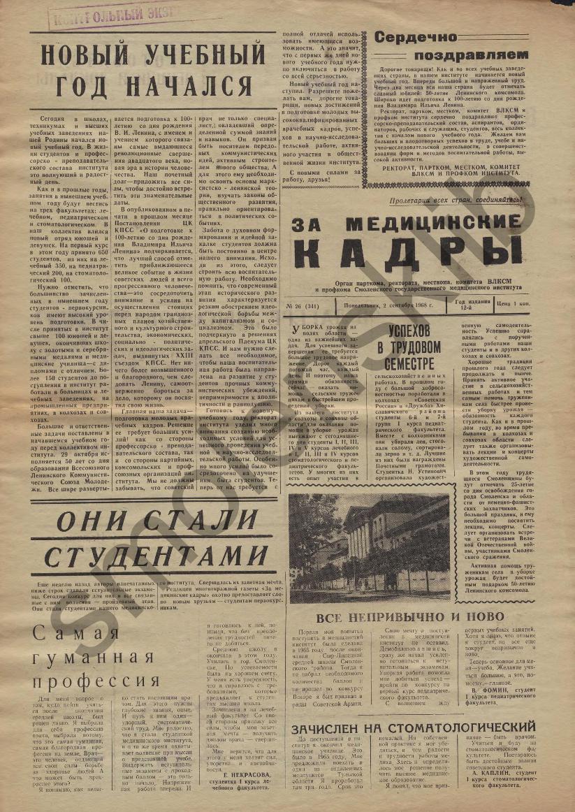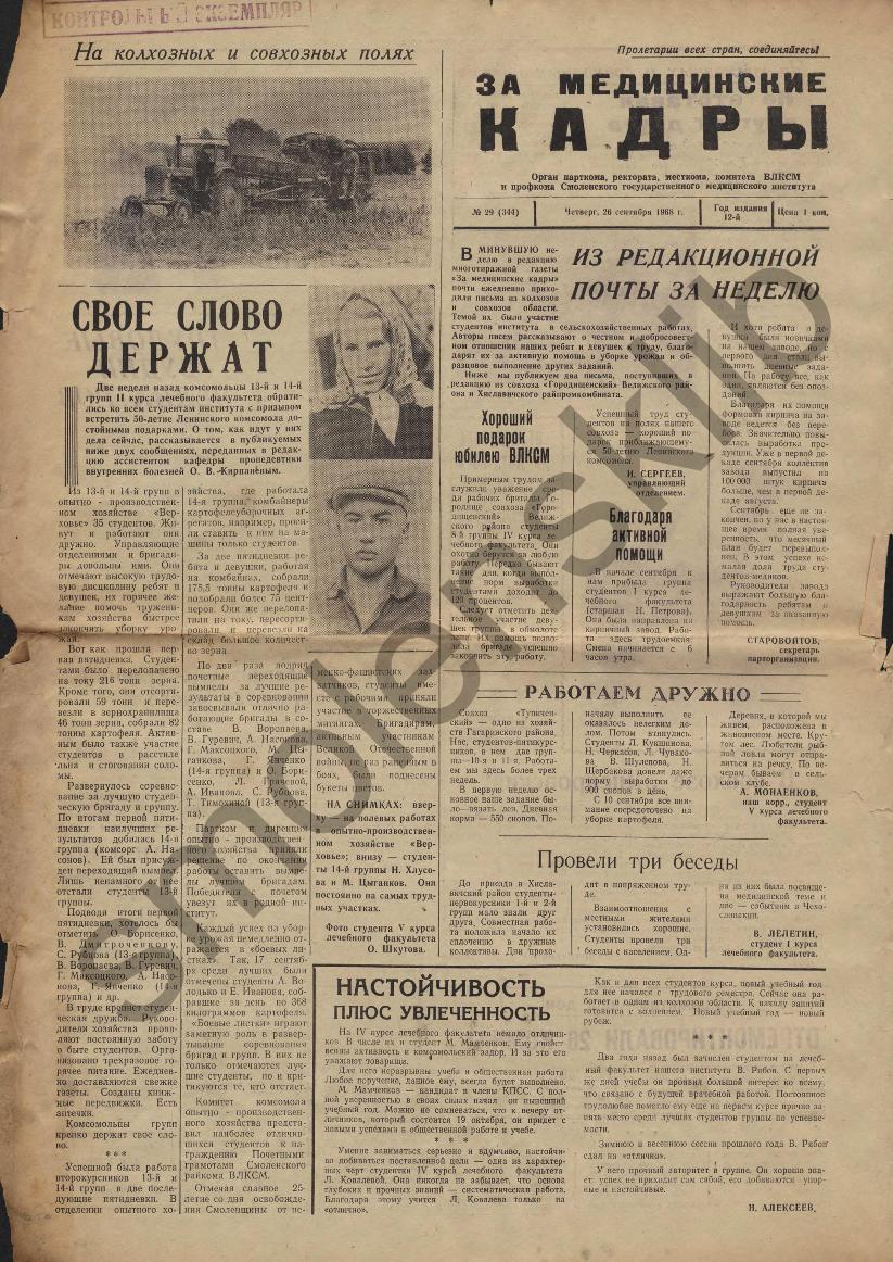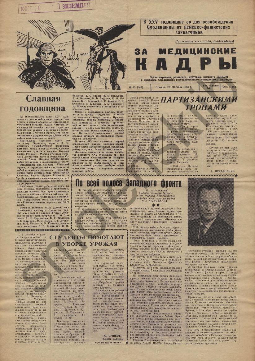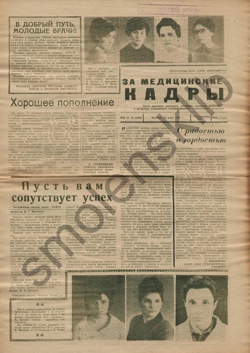 За медицинские кадры: Орган парткома, ректората, месткома, комитета ВЛКСМ и профкома Смоленского государственного медицинского института. — Смоленск: Тип. им. Смирнова, 1957-____. № 26.